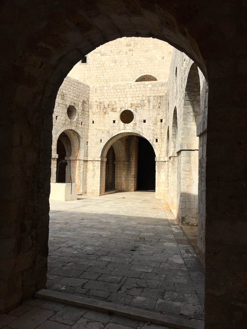 We rested a bit in the early afternoon. By the time we were stirring, it was raining. Streets nearly empty. Also pretty slippery. We did the Ethnographic Museum, the Maritime Museum, Marin Drzic's house, and the Cathedral of St. Basil. The Cathedral was pretty dark, but lots of gold up front. The stained glass windows are very modern art. Obviously replacements since the Homeland War. The receptionist at the hotel had told us about how after the war, they went around to local villages offering to replace people's rooves if they would give them their old tiles, so this is the only building in the old city with old roof tiles. Marin Drzic was a 16th c playwright whom the locals compare to Shakespeare, Moliere, etc. It was more an contemporary art museum with a lot of portraits, but we weren't sure what we were looking at. The Mritime Museum included a lot of paintings of ships at sea. Many of them showed storms and had the Madonna and Child watching from the corner like a blessing. Boats looked REALLY frail for open sea. My sympathies with St. Paul and others who were shipwrecked.