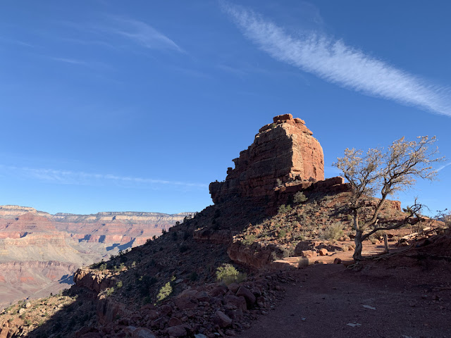 I made the rim by noon after 4 and a half hours on the trail. (I took too many tea breaks to claim 4.5 hours of hiking.) After calling Steve to let him know I was back on the surface, I walked the rim trail as far as Mather Point near the visitor center. Then I hopped a bus to transfer to the red route and see the other end of the park--the part that isn't accessible to cars these days.
