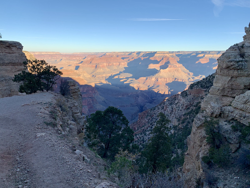 It was 7:30 when I started down the trail, and the rocks were still rosy with the dawn.